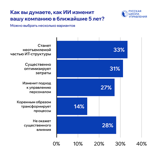 Несмотря на это, ожидания от ИИ — высокие*. Треть респондентов (33%) считают, что в ближайшие пять лет он станет важной частью их ИТ-структуры. 31% надеются, что технологии помогут существенно сократить затраты, а 27% уверены, что изменится подход к управлению персоналом. Для 14% компаний внедрение ИИ может означать полную трансформацию процессов. И только 28% считают, что никакого существенного влияния на бизнес ИИ в ближайшие годы не окажет.