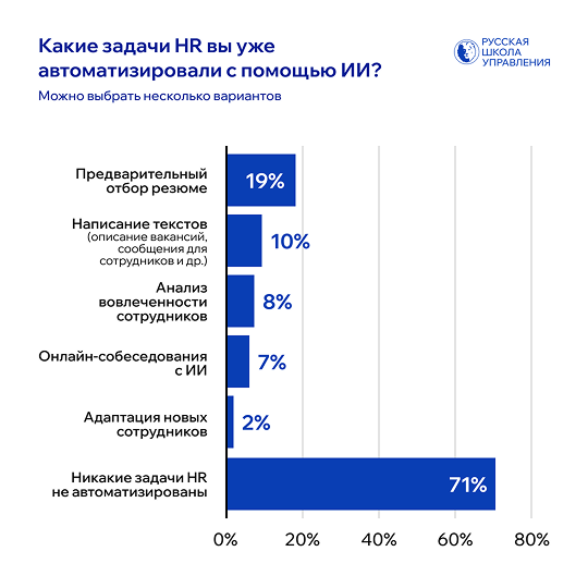 Но подавляющее большинство — 71% — признались, что не автоматизировали с помощью ИИ ни одну HR-функцию.