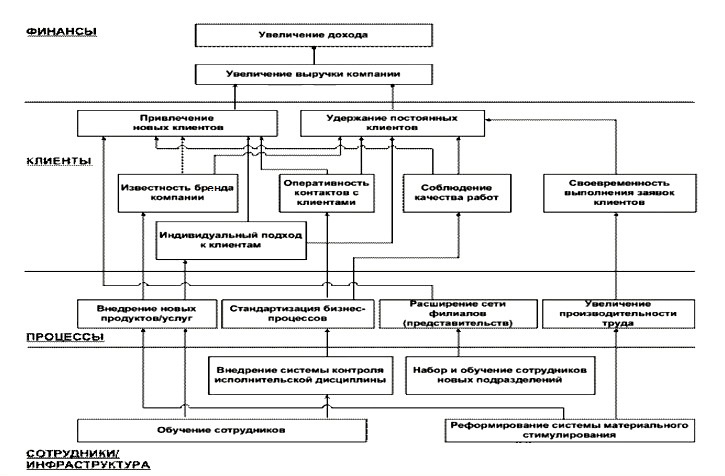 Примерный план карты сбалансированных стратегических целей включает развитие четырех основных взаимосвязанных блоков: