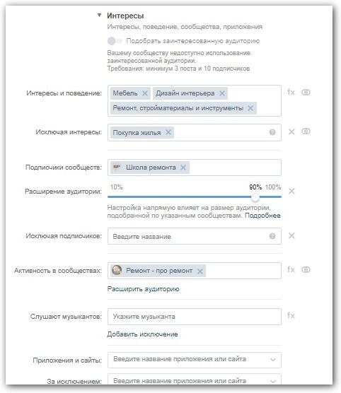 Вручную аудиторию можно настроить максимально точно. Таргетинг ВКонтакте включает в себя выбор интересов и поведения, всех или только активных подписчиков сообществ, музыкальные предпочтения, пользователей приложений и сайтов. Их можно не только добавлять, но и исключать.