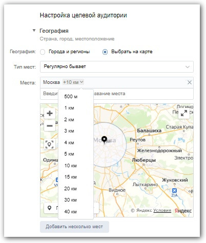Настройка «Тип мест» позволяет выбрать отношение пользователя к выбранной локации. Если у вас местная кофейня, например, и вы хотите настроить объявления на людей, находящихся поблизости, то выбирайте пункт «Сейчас находится» вместо «Регулярно бывает» и отметьте в городах геопозицию заведения. Тогда его увидят пользователи, находящиеся рядом с ним прямо сейчас.