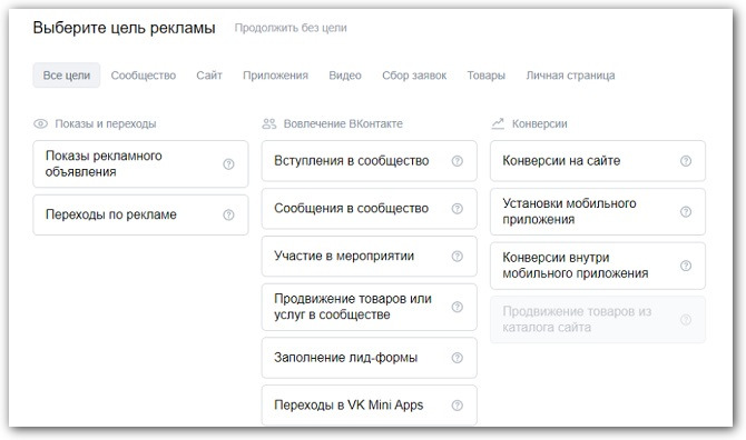 На выбор есть 13 целей для продвижения сообщества или личной страницы, сайта или товаров из каталога, приложений, видео и сбора заявок: